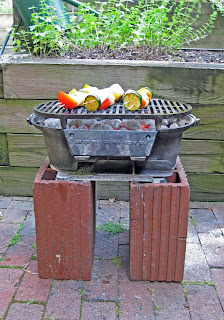 Dinner on a hot summer evening - sourdough baguette thinly sliced topped with roasted red pepper and artichoke tapanade, Olive tapanade, Tzatziki (creamy garlic cucumber dip) and Tabbouli. Marinated vegetable kabobs cooked on the grill with a refreshing mixture of cranberry apple juice and tea over crushed ice. Outstanding.